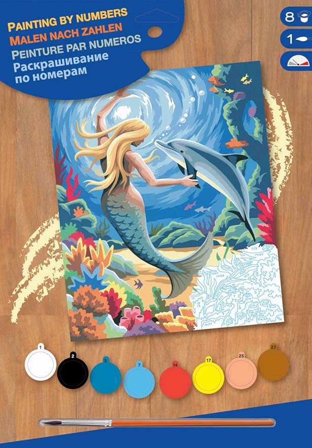 Mammut 8220127 Malen Nach Zahlen Junior Meerjungfrau Nixe Komplettset Mit Bedruckter Malvorlage Im A4 Format 8 Acrylfarben Pinsel Und Anleitung Malset Fur Kinder Ab 8 Jahre Amazon De Spielzeug